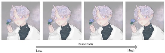 Anime image changes at different resolutions. The anime image resolution gradually increases from left to right. The image is adopted from []. We were given authorization to use an illustration copyrighted by Ms. Dai.