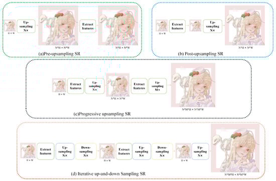 Starting from the early convolutional neural network (CNN)-based SRCNN [], various deep learning methods have been applied to handle super-resolution tasks. The network structure of these deep learning methods can generally be roughly divided into four categories (Figure 2), namely, pre-upsampling SR, post-upsampling SR, progressive upsampling SR, and iterative up-and-down-sampling SR [].