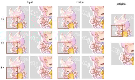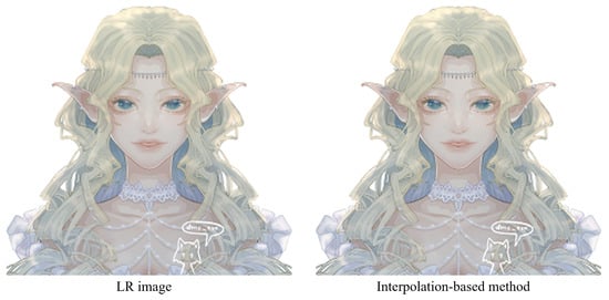 Anime combines graphic art, characterization, cinematography, and other forms of creative and individualistic techniques []. The earliest commercial anime in Japan dates back to 1917. A distinctive art style emerged in the 1960s with manga artist Osamu Tezuka’s work and spread over the following decades, developing a large domestic audience. With the popularization and promotion of Japanese anime, Japanese anime with various themes is respected and loved in Asia and worldwide. As of 2016, Japanese anime accounted for 60% of global animated TV shows []. In 2019, the annual export value of Japanese animation exceeded USD 10 billion. At the same time, with the improvement of image quality on various playback platforms, people have higher and higher requirements for the resolution of anime works. Anime works of different resolutions bring viewers different viewing experiences. As shown in Figure 1, even for the same anime image, we prefer the image with a higher resolution.