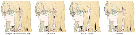 The results of super-resolution methods. (a) Original high-resolution anime image. (b) SR anime image generated by Waifu2x. (c) SR anime image generated by Real-ESRGAN. (d) SR anime image generated by SwinIR (image restoration using Swin Transformer). For Waifu2x, the blur and checkerboard artifacts problems are in the green and blue circles. For Real-ESRGAN, the circled area shows the hallucinations problem. For SwinIR, the circled area shows the lack of detail, such as line misjudgments. The image is adopted from [].