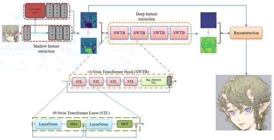 Image super-resolution (ISR) technology aims to enhance resolution and improve image quality. It is widely applied to various real-world applications related to image processing, especially in medical images, while relatively little appliedto anime image production. Furthermore, contemporary ISR tools are often based on convolutional neural networks (CNNs), while few methods attempt to use transformers that perform well in other advanced vision tasks. We propose a so-called anime image super-resolution (AISR) method based on the Swin Transformer in this work. The work was carried out in several stages. First, a shallow feature extraction approach was employed to facilitate the features map of the input image’s low-frequency information, which mainly approximates the distribution of detailed information in a spatial structure (shallow feature). Next, we applied deep feature extraction to extract the image semantic information (deep feature). Finally, the image reconstruction method combines shallow and deep features to upsample the feature size and performs sub-pixel convolution to obtain many feature map channels. The novelty of the proposal is the enhancement of the low-frequency information using a Gaussian filter and the introduction of different window sizes to replace the patch merging operations in the Swin Transformer. A high-quality anime dataset was constructed to curb the effects of the model robustness on the online regime. We trained our model on this dataset and tested the model quality. We implement anime image super-resolution tasks at different magnifications (2×, 4×, 8×). The results were compared numerically and graphically with those delivered by conventional convolutional neural network-based and transformer-based methods. We demonstrate the experiments numerically using standard peak signal-to-noise ratio (PSNR) and structural similarity (SSIM), respectively. The series of experiments and ablation study showcase that our proposal outperforms others.