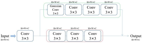 In order to better obtain high-frequency features of images, we hope that the input of our deep feature extraction network contains more texture detail feature changes. In Alexnet [], it is mentioned that the most original texture detail feature changes of the image should be captured with large convolution kernels, such as 7 × 7, 11 × 11 convolution kernels, to extract features. Large-sized convolution kernels can bring a larger receptive field but also introduce a larger amount of computation and more parameters, so we used three 3 × 3 convolution kernels instead of 7 × 7 convolution kernels. We added three convolutional layers  with kernel size 3 after both  and .