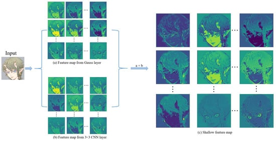 Most anime images consist of simple lines and textures compared to general drawings. Therefore, we should focus more on low-frequency information to extract the features of anime images. Thus, in addition to the normal feature extraction layer (red frame), we set a feature extraction layer for the low-frequency filtered data (green frame). Our shallow feature extraction network part is mainly based on a convolutional neural network (see Figure 6). Initially, the input image uses a convolutional layer with a 3 × 3 convolution kernel to extract features. These features are then passed into three 3 × 3 convolutional layers (red frame) and a Gaussian convolution kernel, followed by another three 3 × 3 convolutional layers to obtain image features that retain low-frequency information (green frame).