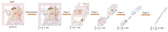 Swin Transformer [] is a transformer model with a hierarchical design that includes shifted window operations. It splits the image into windows of the same size and computes self-attention only within the windows each time. In order to obtain more global information, Swin Transformer proposes a shifted window operation. Restricting attention computation to a window can introduce the locality of CNN convolution operations on the one hand, and save computation on the other. In addition, the entire model adopts a hierarchical design, including a total of four stages (see Figure 10).