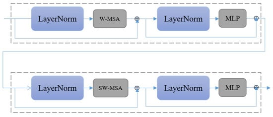 Two successive Swin Transformer layers. W-MSA is window self-attention mechanism. SW-MAS is shifted window self-attention mechanism.