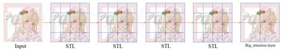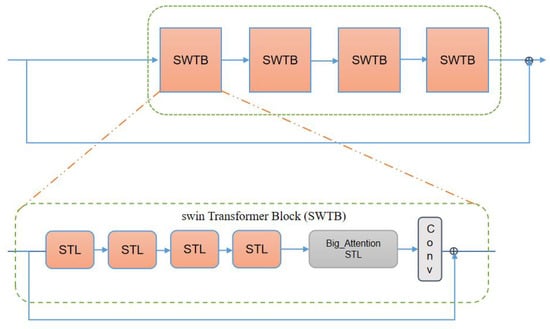 Our deep feature extraction network is mainly based on the Swin Transformer. We removed the patch merging operation to keep our feature map size in a constant state. Our deep feature extraction network is composed of four Swin Transformer blocks (see Figure 12), and each SWTB has four Swin Transformer layers and a big attention layer.