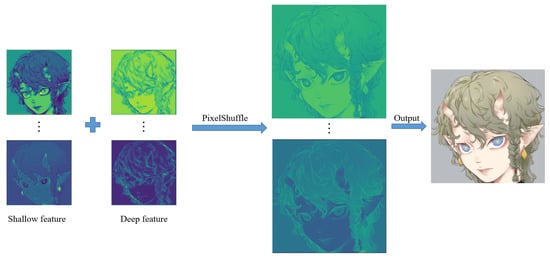 Convolutional neural networks are more suitable for early vision processing, which can produce more stable and high-quality results. In addition, our shallow feature extraction network also includes processing low-frequency information of images. The low-frequency information of the image often refers to the continuous gradient area in the picture. That is, the image content within the edge is the low-frequency information. The image’s low-frequency information is the image’s preliminary information, which contains the rough outline and general appearance. In the high-resolution image reconstruction task, the low-frequency information carried by the low-resolution image (LR) and the super-resolution image (SR) is similar, so it is necessary to extract the low-frequency information. Therefore, in our shallow feature extraction network, we increase the processing of low-frequency information. After a layer of Gaussian filter, the low-frequency information is well preserved, and the high-frequency information is filtered (see Figure 7). There are not many detailed textures in anime images and many color areas are in blocks, so the low-frequency information occupies a considerable part. Better utilization of low-frequency information is helpful for subsequent image reconstruction work.