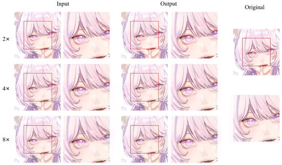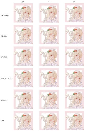 Following Figure 26 and Table 5, we can confirm that the proposed model achieves the best results under the 2×, 4×, and 8× tasks, followed by SwinIR. Our model can perform super-resolution tasks well in different application scenarios (anime faces, anime characters, anime buildings, anime animals, etc.).