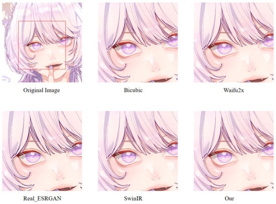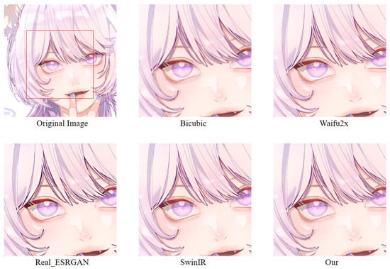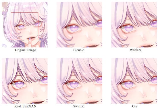 For example, Waifu2x [] is an anime super-resolution method based on convolutional neural networks. Subject to the shortcomings of the convolutional layer itself, the animation images generated by Waifu2x are often blurred (see Figure 4b). Although image super-resolution methods based on generative adversarial networks (GANs) have been proposed to alleviate the above problems, the resulting hallucinations also bring significant challenges to the SR task. For example, the Real-ESRGAN [] model based on GAN achieves an excellent visual effect when performing anime image super-resolution tasks, but there are some hallucinations (see Figure 4c). The SwinIR based on the Swin Transformer improves the details of the generated image by enhancing the global perception ability; however, global awareness is reduced because it abandons the patch merging operation. Therefore, these lead to some lack of details in the generated anime images (see Figure 4d).
