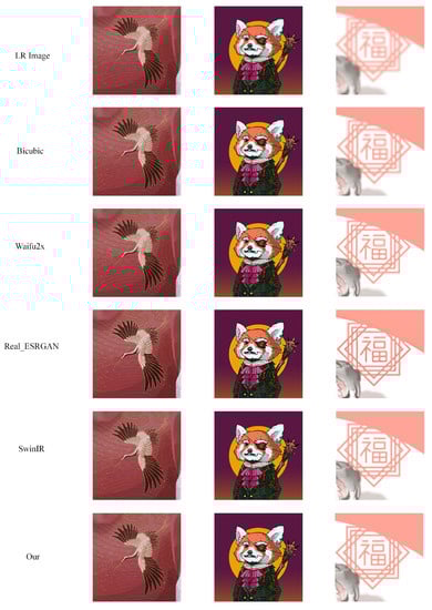 The results of three example images from the Multi-level anime83 test dataset for different super-resolution methods at 4× super-resolution task are shown in Figure 26. Compared with the crane patterns on the clothes of anime characters, the super-resolution images generated by the Bicubic method are still very blurry. The super-resolution image lines generated by Waifu2x are not smooth. The super-resolution images generated by Real-ESRGAN, SwinIR, and ours are not very different from a visual point of view. The same situation occurs in the second super-resolution task on animal characters. However, we can find that the lines generated by Real-ESRGAN are always slightly thicker. The gap between the three can be observed in the third anime picture with Chinese characters. Real-ESRGAN has obvious errors in some strokes. Compared with our generated Chinese characters, the Chinese characters generated by SwinIR have poor regularity and insufficient color uniformity.