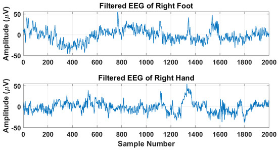 For BCI, two types of oscillations play a vital role, Rolandic mu and central beta lying in the frequency range of 7-30 Hz [52]. These oscillations originate in the sensorimotor cortex. Hence the EEG signals are bandpass through a sixth-order Butterworth IIR filter in the frequency range of 7-30 Hz. After the BPF, the filtered data of RF and RH has been segmented into 250 and 200 epochs of length 2000 samples each for every channel for further processing. The RF and RH EEG signals are shown in Figure 2, respectively. It is evident from the Figure that both filtered EEG signals of RF and RH have the same amplitude range, making it difficult to classify MI tasks.