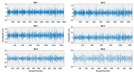 where P is the number of signals belonging to each class and C are the number of classes. The examples of subbands obtained after r-TQWT decomposition for RF and RH brain activities are shown in Figure 3 and Figure 4. It is seen from the Figures that subbands of RH and RF have different amplitude ranges, which depicts their better discrimination ability. Thus, the decomposition of r-TQWT extracts insight information of the EEG signals. Therefore, the idea of r-TQWT is justified for detecting brain activities.