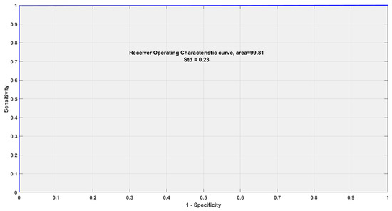 As the RBF kernel overperforms other kernels, it is used to evaluate the performance parameters of channel-1. Table 5 shows the results of the performance parameters evaluated on all the SBs of channel 1. Five performance parameters are evaluated to test the dominance of the proposed methodology, viz. ACC, sensitivity (SEN), specificity (SPE), F-1 score and Matthews correlation coefficient (MCC), respectively. As observed from the table, SB5 gives the best results, while SB-6 is the worst performing SB. ACC of 99.78%, SEN and SPE are 99.60% and 100%, F-1 score is noted 0.998 while MCC 99.55%is marked as best scores for SB5. Worst values of ACC, SEN, SPE, F-1 score and MCC is obtained in SB6 as 72.44%, 75%, 69.19%, 0.752% and 44.14% respectively. The binary classification ability of the model is evaluated using the analysis of receiver operating characteristics and area under the curve, as shown in Figure 5. Our model has obtained the area under the curve of 99.81% with a minimal standard deviation depicting its binary classification ability. The confusion matrix of RF and RH is indicated in Table 6. The confusion matrix of RF is given 100% correct and 0% misclassification, while RH provides an incorrect classification of 0.5% and 99.5% of correct classification.