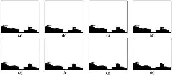 Segmentation example of sky region, (a–h) show the different results of the sky segmentation under different parameters, (a) th1 = 60, th2 = 60, th3 = 180, (b) th1 = 70, th2 = 70, th3 = 190, (c) th1 = 70, th2 = 80, th3 = 190, (d) th1 = 70, th2 = 80, th3 = 200, (e) th1 = 70, th2 = 90, th3 = 200, (f) th1 = 70, th2 = 95, th3 = 200, (g) th1 = 70, th2 = 95, th3 = 205, (h) th1 = 70, th2 = 95, th3 = 215.