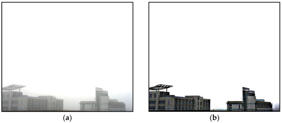 He et al. considered that the intensity at one of the RGB (red–green–blue) image channels is always close to 0 in their dark channel prior algorithm. According to this assumption, the dark channel image was obtained and was estimated. The dark channel prior algorithm avoids errors related to the heuristic selection of . However, the sky region does not follow the dark channel prior assumption. When a large sky region is acquired in an image, the corresponding is inaccurate, producing texture and blocking effect in the restored fog-free image, which reduces the image quality. In the literature [15,16], a small region far enough from the target was selected as the sky region, and the pixel in this region was calculated and solved to obtain the . However, this method has certain subjectivity and cannot ensure that the selected sky region is globally representative.