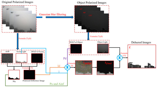 where , , and are the polarization degrees of the scene, object, and atmosphere, respectively, and are the light intensities of the objects and air light, respectively, and is the polarization-difference image.