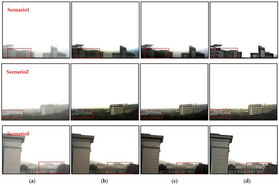 Figure 7 scenario1–scenario3 shows different outdoor experimental scenes. In Figure 7a is the original fog-containing scene, Figure 7b is the dark channel processing result, Figure 7c is the processing result of the SIDMP, and Figure 7d is the defogging result of the proposed method. It can be seen that all the three dehazing algorithms have obvious dehazing effect. However, when dealing with high light intensity and large area sky image, large area halo effect will appear in the non-hazing image reconstructed by dark channel dehazing algorithm, which reduces the image quality and affects the observation of image details. The SIDMP reduces the brightness of the halo, but cannot effectively suppress the area of the halo, and the target is still in a large area of the halo background. When the fog-free image is reconstructed using the method proposed in this paper, the area of halo is effectively reduced, and the visual quality of the image is improved by optimizing the sky area.