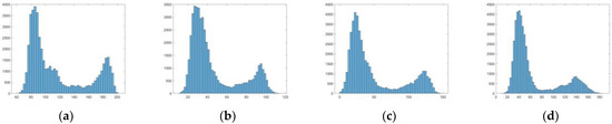 Histogram comparison results, (a) result of the original hazy images, (b) result of dark channel, (c) result of SIDMP, (d) result of proposed method.