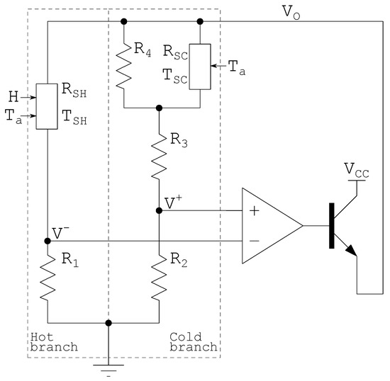 Considering that, in steady state, the voltages and are approximately equal, it becomes possible to determine the sensor resistance that is greater than zero, as a ratio of the resistances of the Wheatstone bridge: