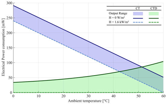 The increase of useful output range reflects directly on the device sensitivity that presents more constancy in all ambient temperature range, and in power consumption. The power consumption of our proposed architecture is significantly at lower temperatures when compared with classical architecture, as shown in Figure 8. The energy consumption of the proposed architecture is only higher at high temperatures due to the that is generally great in CTD than CT architecture. The power consumption is an important parameter for this type of device as it can be powered by batteries and deployed in remote locations.