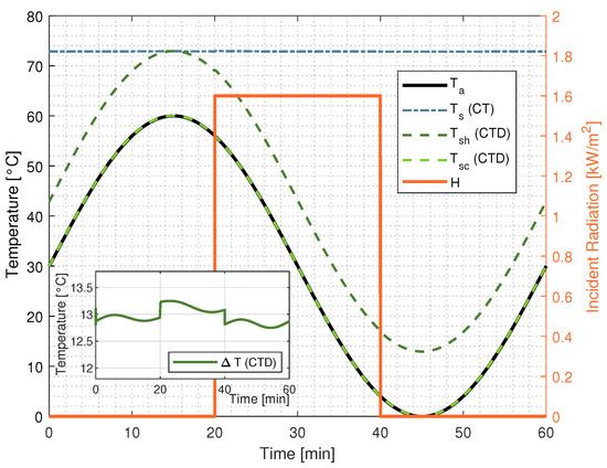 A simulation was also performed using a SPICE environment with the classic architecture (CT) and the proposed architecture (CTD), considering varying both the ambient temperature and the incident radiation. The objective of this simulation was to verify if the temperature of the heated sensor would follow the intended reference and to explore the effects of using the temperature difference in the estimation of H.