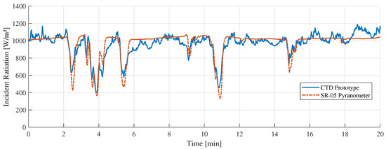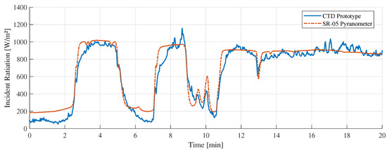 A set of field experiments were performed with the proposed CTD pyranometer that is compared to SR-05 as a reference pyranometer. The main difference between the SR-05 pyranometer and proposed CTD pyranometer is the response time. The SR-05 has a response time of ≈18 s, while our proposed architecture shows a response time in milliseconds due to the high proportional feedback gain.