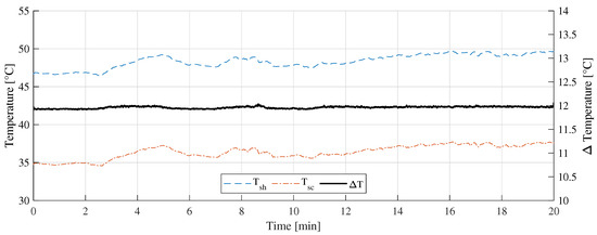 Figure 17 shows the “C” measurement taken on 18 February 2022 at 11:30 a.m. with cloudy weather conditions. Nimbostratus clouds were present but without rain. Figure 18 shows the measurement difference between the CTD prototype and the pyranometer in “C” measurement. The absolute error measured was W/m. Figure 19 shows the temperatures of the hot sensor (), cold sensor (), and the temperature difference ().