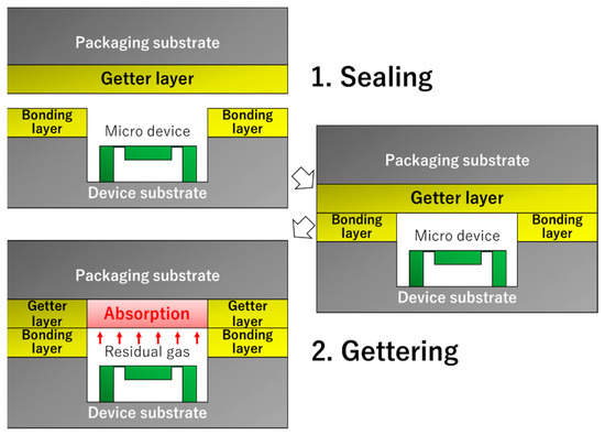 Additionally, it is known that the Au/Ti layer can function as a non-evaporative getter (NEG), which absorbs residual gas molecules in the package [12]. When the Au/Ti layer was annealed, the thermally diffused Ti atoms reached the surface and reacted with the residual gas. We demonstrated that smooth Au/Ti films can form direct bonds at room temperature and absorb residual gas molecules by post-bonding annealing at 200 °C [13]. It is believed that the direct bonding of the Au/Ti films can contribute to a simple MEMS packaging process in which a wafer coated with the NEG film can form a seal and cause gettering, as illustrated in Figure 1. In addition, the direct bonding of MEMS device wafers having NEG films with cap wafers also allows a simple vacuum packaging process.