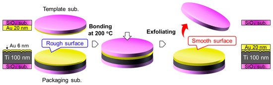 The first approach utilizes a traditional TS process, as shown in Figure 2. A 100-nm-thick Ti layer was deposited on the SiO2 template; subsequently, a 6-nm-thick Au layer covered the Ti layer. The Au/Ti getter layer had a relatively rough surface for the formation of direct bonding. The Au/Ti layer was bonded with a 20-nm-thick Au thin film deposited on a SiO2 template, which has an atomically smooth surface with an RMS roughness of ~0.2 nm, at 200 °C under a bonding load of 1.27 MPa (10 kN for a 4-inch diameter). Because the deposited Au layer badly adhered to the SiO2 surface, the Au/SiO2 interface could be exfoliated without significant mechanical deformation.