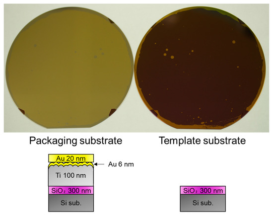 Figure 3 shows a photograph of the wafers after the TS. The photograph of the thermally-oxidized Si substrate (template) is shown in the supplementary material. The appearance of the bare template substrate and that after the TS step is similar. It indicates that most of the Au film on the template substrate was transferred to the packaging substrate. Au films were present on the template substrate after the TS process because bonding was not formed in these areas owing to the wafer shape of the edges and particles adhered to the surfaces.