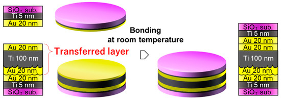 To demonstrate the packaging process using the transferred Au/Ti/Au getter layer, the surface was bonded with another SiO2/Si substrate with a 20/5-nm-thick Au/Ti bonding layer at room temperature, as illustrated in Figure 8. The Au surfaces were cleaned by irradiation with Ar plasma and thereafter contacted at room temperature under a bonding load of 123 kPa (1000 N) in a vacuum of 1 × 10−2 Pa.