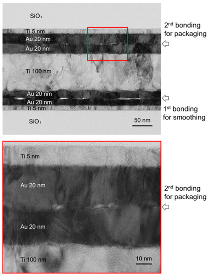 Nanoscale observations were performed using TEM, as shown in Figure 11. The ultrathin TEM specimen was prepared using a focused ion beam on the cross-sectional surface of the diced chip. In this image, the unbonded areas at the Au/Au bonding interfaces were observed as brighter regions. At the interface formed by the first bonding step, the unbonded areas tended to be larger, and some were connected to each other. The connected unbonded areas may become leak paths to the packaged environment. Meanwhile, as shown in the bottom image, the size of the unbonded areas is 10 nm or less, and these voids are not connected. Thus, it is assumed that the leak path was not formed by the direct bonding of the transferred Au/Ti/Au getter layer. In our previous studies, the Au/Au bonding interface with such voids could form hermetic sealing at room temperature [25,26]. In addition, the hermeticity was improved by the following annealing step for getter activation [26].