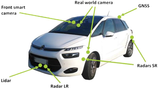 To this end, we use lane change samples performed by human drivers from MOOVE (MOnitoring Outillé pour le Véhicule dans son Environnement (Tooled Monitoring for the Vehicle in its Environment)) database [26], a naturalistic driving database of the Vedecom Institute that was introduced in 2015 and meant to provide a better interpretation of the environment as it would be perceived by autonomous vehicles. Over 1 million km have been gathered by using human-driven cars equipped with standard autonomous cars sensors (radars, lidar, and cameras, Figure 1). The recorded data represent all possible circulation conditions. The database includes both quantitative and qualitative variables for all the surrounding vehicles detected by the sensors and the ego-vehicles. The data are recorded in real time then imported in a data center to perform analyses and merge data from the sensors to obtain a more robust measurement.