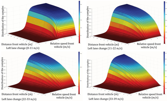 To quantify the degree of risk, we take into account the longitudinal distance and relative velocity between the ego-vehicle and the vehicles in the target lane. When the distance is reduced and/or the relative speed is lowered, collision probability increases, so risk is considered higher. We use a naturalistic driving database to assess risk generally adopted by human drivers during lane change maneuvers [27]. FFor each vehicle in the future lane, we obtain a bi-variant histogram that represents the distribution of lane-changing samples in a database over longitudinal distance and relative speed to the ego-vehicle. We also split the scale into four ego-vehicle velocity ranges, 0–11 m/s, 11–22 m/s, 22–33 m/s, and 33–39 m/s, which correspond to four driving modes resulting into different behavior.