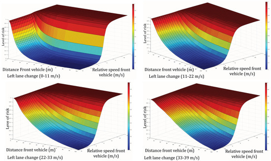 Moreover, an inversion of the scale is performed, wherein 1 (which means that a maximum of drivers is inclined to make a lane change in such a situation) becomes 0 (which means minimum risk) and 0 becomes 1. The result is described by Equation (3) and represented in Figure 3.