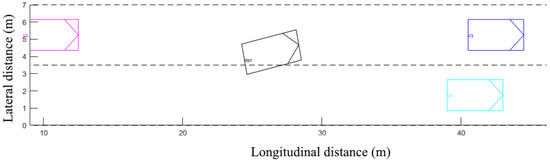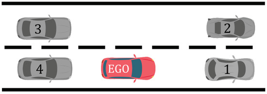 Road configuration with the surrounding vehicles before the maneuver (red: ego-vehicle).