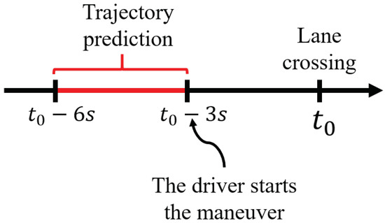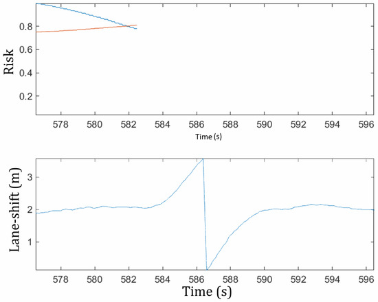 To confirm this assumption, the algorithm was tested on samples of lane-changing maneuvers extracted from the MOnitoring Outillé pour le Véhicule dans son Environnement (Tooled Monitoring for the Vehicle in its Environment) (MOOVE) database. A path prediction was made between 6 s and 3 s before lane crossing (Figure 5) to simulate the decision in real time and calculate the risk of the expected trajectory. For situations such as the one previously described, this gives us a model as described in Figure 6. The lane shift of the ego-vehicle represents the lateral distance between the center of the front bumper and the right lane marking. The discontinuity in the middle of the curve coincides with the time of the lane crossing. The top one is the evolution of risks based on the predicted trajectories over time. As we can see, the crossing moment is close to the moment when the driver starts the maneuver. In the samples we tested, it is between and s.