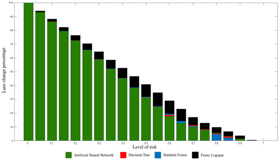 For the obtained results with the driving simulator, two interesting remarks are noted: First, the table shows that the algorithms behave very similarly, with close positive and negative decision rates, with a noticeable difference in fuzzy logic. This is again explained by the fact that the first three algorithms are based on learning, while the last one is based on manual adjustment. Secondly, the table tells us about the similarity of behavior between the algorithms but does not tell us about the level of risk taken during the maneuvers. To this end, we must look at the histograms in Figure 13. We notice the same trend for all the algorithms but also that fuzzy logic takes more risk than the other algorithms, which shows that the algorithms developed in this article are not only more similar to human behavior but also that they take less risk within the simulator. We can also notice that the lane change rate for a risk greater or equal to is lower than for all the algorithms, with a minimum established at for random forest. We therefore conclude that random forest is the one that obtained the best results among those compared in this paper.