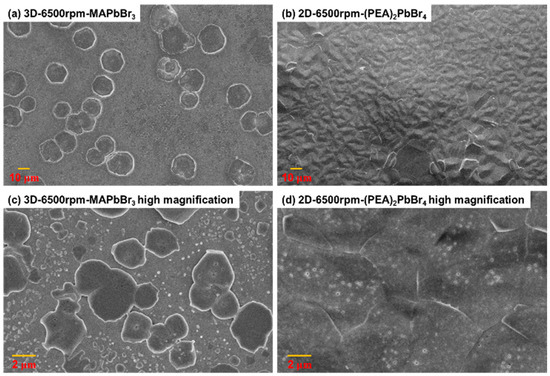 Low and high magnification field-emission scanning electron microscope (FESEM) images of (a,c) 3D-6500rpm-MAPbBr3 and (b,d) 2D-6500rpm-(PEA)2PbBr4 perovskites.
