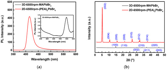 Comparison of (a) photoluminescence (PL) intensities and (b) X-ray diffraction (XRD) patterns of 3D-6500rpm-MAPbBr3 and 2D-6500rpm-(PEA)2PbBr4 perovskites.