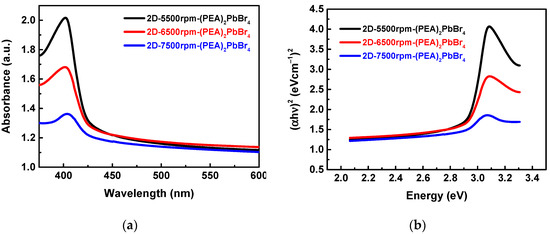 (a) Optical absorption spectra and (b) (αhν)2 vs. energy plot of 2D-(PEA)2PbBr4 with different spin speeds.