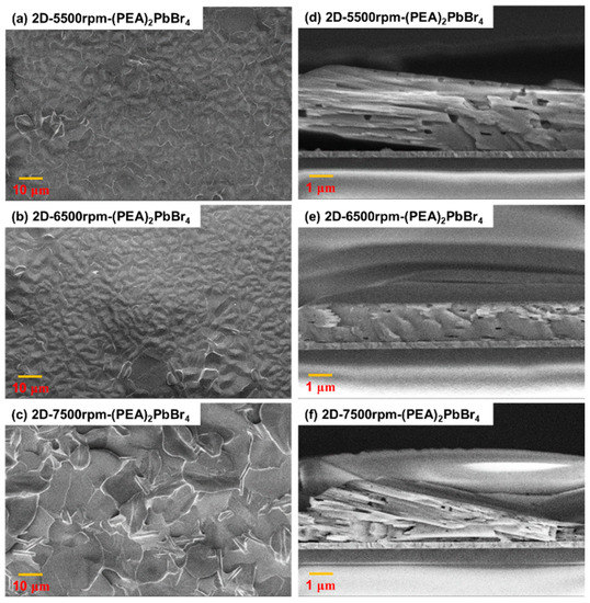 (a–c) Top view and (d–f) cross-section field-emission scanning electron microscope (FESEM) images of 2D-(PEA)2PbBr4 films formed with different spin speeds.