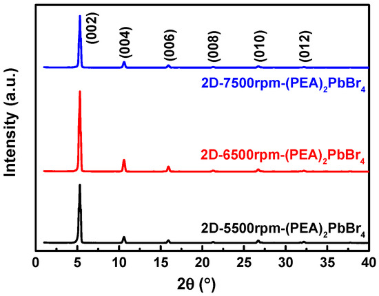 X-ray diffraction (XRD) patterns of 2D-(PEA)2PbBr4 films formed with different spin speeds.