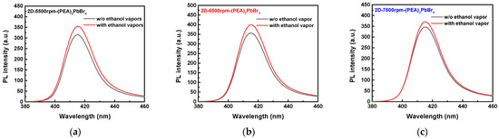 During the fabrication of the perovskite films, high-density crystal defects were produced on the surface owing to the evaporation of organic solvent during annealing. These defects hindered the movement of electrons in the conductive band. Thus, the perovskite thin film exhibited low conductivity. However, after the perovskite film absorbed the target vapor, these defects passivated and the electrons trapped in the defects were released into the conductive band, increasing the film conductivity. After absorbing the N2 inert vapor, the specific vapor was discharged, and the crystal defects formed again on the film. This was proved by the PL measurements. The graph in Figure 9 shows that the measured PL intensities before the exposure to ethanol vapors were all lower than those after the exposure to ethanol vapors. This was because after the exposure to ethanol vapors, the density of crystal defects decreased, increasing the crystallinity. Thus, the PL intensities also increased. The PL intensities measured for the 2D-(PEA)2PbBr4 films formed at different spin speeds were shown in Figure 9. After the exposure to ethanol vapors, the PL intensities slightly increased. However, as the 2D-(PEA)2PbBr4 film thickness changed, the PL intensities varied. The PL intensity of the 2D-(PEA)2PbBr4 film formed at 6500 rpm was the highest. Thus, the corresponding crystal structure was denser and more uniform, which was consistent with the I–V measurements.