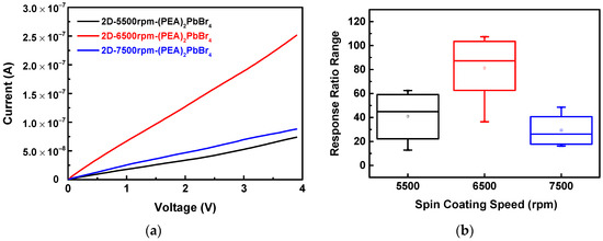 (a) Current–voltage (I–V) curves and (b) response ratio ranges of 2D-(PEA)2PbBr4 films formed at different spin coating speeds to ethanol vapors.