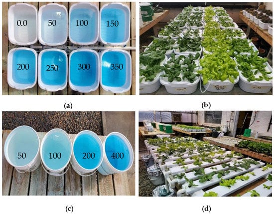 (a) Nutrient solutions in different concentrations, ppm; (b) four lettuce cultivars, including Parris, Tacitus, Black Seed Simpson, and Rex (left to right), grown in hydroponic tubs; (c) nutrient solutions in different concentrations, ppm; (d) four lettuce cultivars, including Parris, Black Seed Simpson, Rex, and Tacitus (left to right), grown in the NFT system for ten days.