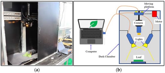 HSI of freshly cut, randomly selected four leaf samples of each lettuce species grown in a hydroponic tub and NFT system were acquired using a push-broom scanning hyperspectral camera (Pika XC2, Resonon Inc, Bozeman, MT, USA) with 1600 spatial pixels and 462 spectral bands ranging between 390.57–1008.6 nm with fixed Xenoplan lens (1.4/23-0902, Schneider Kreuznach, Stockach, Germany) with a focal length of 23 mm and 23.10 with IFOV of 0.52 mrad (Figure 2a). The HSI system was installed in a closed dark chamber (Figure 2b). The HSI unit has a built-in self-correction for white and dark references. All captured HSIs were acquired via a laptop using Spectronon 3 software provided with the camera.