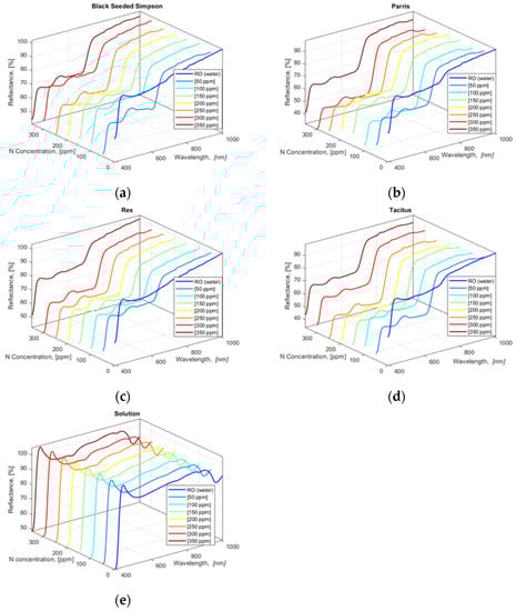 Averaged and smoothed reflectance values of HSI pixel values of four freshly cut lettuce cultivars: (a) Black Seeded Simpson, (b) Parris, (c) Rex RZ, and (d) Tacitus and (e) solution in hydroponic tubs with different N concentrations.