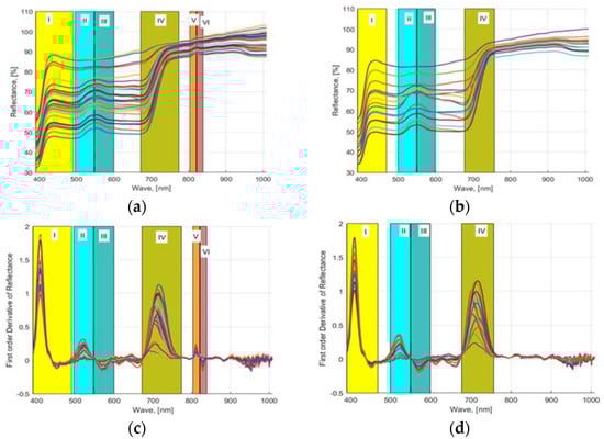 As mentioned in Section 2.6, wavebands were selected using three approaches. First, a first-order numerical derivative of the averaged (smoothed) reflectance values was performed and plotted against the waveband values. Figure 4a,c shows the computed 32 NDS data (provided in S1 Supplementary Material) obtained from the acquired HSI images of lettuces grown in hydroponic tubs and the computed FDR values from the 16 NDS data, respectively. Similarly, Figure 4b,d shows the computed 16 NDS data obtained from the acquired HSI images of lettuces grown in NFT system and the computed FDR values from NDS data, respectively. The plotted FDR values clearly showed six distinctive dynamic waveband regions for hydroponically grown lettuce (Figure 4a–c) and four regions for lettuce cultured in the NFT system (Figure 4b–d). Region 1: 390.57 to 491.3 nm, region 2: 496 to 547 nm, region 3: 548 to 600 nm, region 4: 671 to 775.16 nm, region 5: 803.5 to 820.16 nm, and region 6: 821.61 to 839 nm waveband regions of HSI data of the lettuces grown in hydroponic tubs from FDR were identified, and six waveband values 410.33, 522.71, 567.88, 713.51, 811.75, 829.31 nm were determined from these regions. Similarly, for the lettuce grown in the NFT system, 390.9 to 470, 499 to 549, 550 to 599, and 675.98 to 757 nm bandwidth regions were identified, and four waveband values 410.33, 521.38, 571.87, and 713.51 nm were found. For plants, the most useful wavelength ranges for analysis are the visible range in combination with the near-infrared range. In this wavelength range, changes in leaf pigmentation at 400–700 nm and mesophyll cell structure at 700–1300 nm can be detected. However, to detect changes in the water content of a plant, extended ranges are required 1300–2500 nm []. In the studies, it was found that the wavelength range of 400–900 nm responded very well to plant characteristics []. The ranges 4, 5, and 6 found for hydroponics are consistent with the wavebands of 700 to 709, 780 to 787, and 817 to 821 nm, which were found to be appropriate for the HSI analysis of spinach and bok choy leaves in the studies of Nguyen and Nansen []. Two other studies showed that the bandwidth range of 670 to 760 nm provides very accurate prediction models for healthy vegetation []. In the previous studies of the authors with four different hydroponically grown cultivars with different N applications, four waveband regions, i.e., 506.33 to 601.11, 670 to 760, 808 to 820, and 821 to 833 nm, were determined to be most appropriate for nutrient-estimation models [].