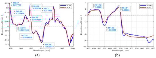 Second, using the found multivariate linear regression model coefficients from the PLSR and PCA by taking the whole range of wavebands of 390.96 to 1008.20 nm and plotting values against wavebands, six waveband values in the most significant dynamic regions from the plotted data were located for a hydroponic system (Figure 5a) and NFT system (Figure 5b). Six essential HSI reflectance values corresponding to 390.57, 455.19, 542.62, 589.18, 621.17, and 701.44 nm wavebands for a hydroponic system and four HSI values corresponding to 431.42, 551.92, 684.01, and 721.56 nm for NFT system were found.